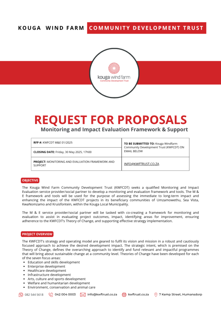 The Kouga Wind Farm Community Development Trust (KWFCDT) seeks a qualified Monitoring and Impact Evaluation service provider/social partner to develop a monitoring and evaluation framework and tools. The M & E framework and tools will be used for the purpose of assessing the immediate to long-term impact and enhancing the impact of the KWFCDT projects in its beneficiary communities of Umzamowethu, Sea Vista, KwaNomzamo and Kruisfontein, within the Kouga Local Municipality.